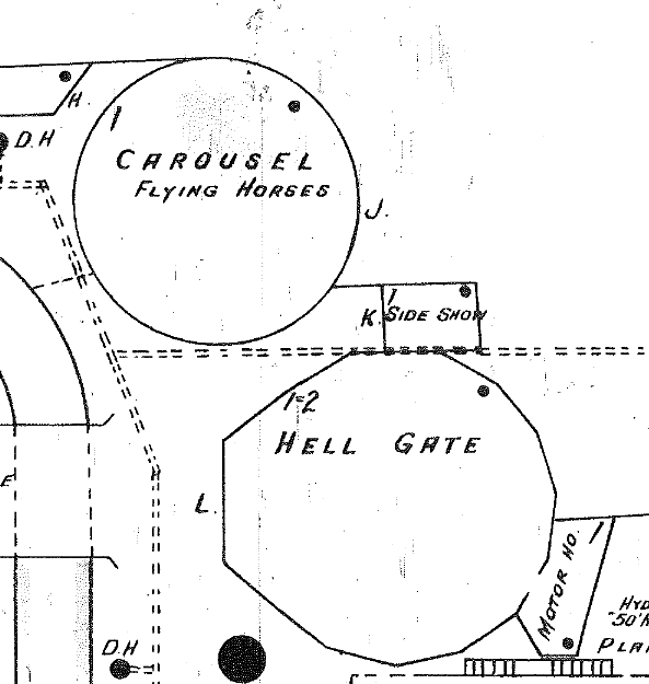 The Carousel and Hell Gate on the Sanborn map and in a panoramic shot from the top of the Shoot the Chutes