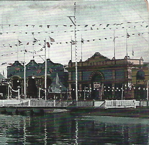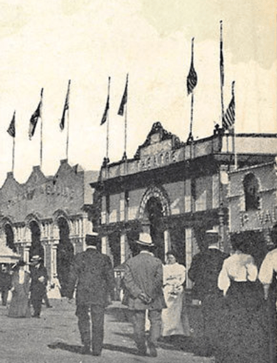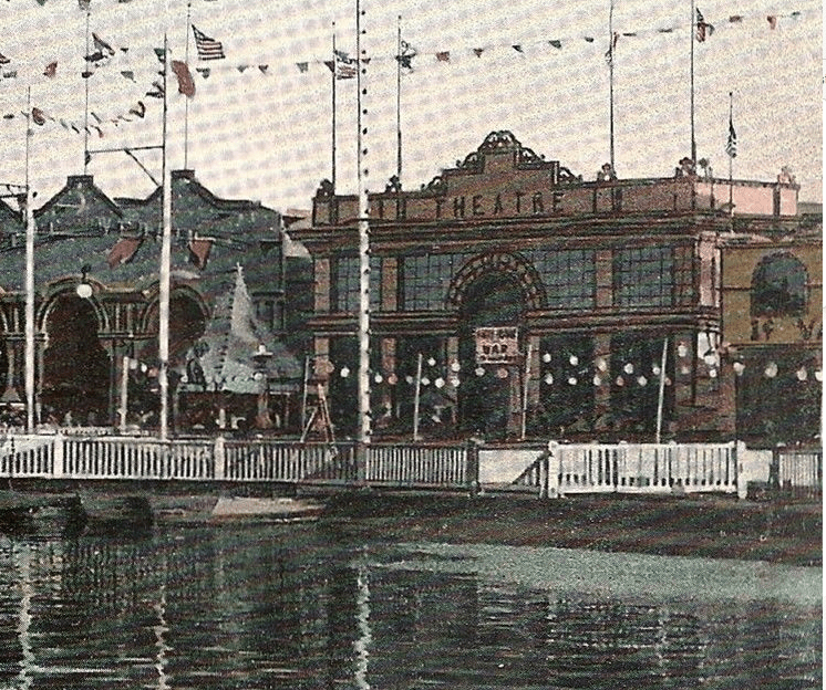 There really isn’t a good image of the Wonderland Penny Arcade, although you can make out the “1” and the “cents” symbol. It stood between the Administration Building/Walnut Street Entrance and the Theater. You can get glimpses of it in some photographs showcasing other buildings. This closeup from a 1906 postcard of the structures near the end of the Lagoon shows, from left to right, the Fatal Wedding building, the Theater (with a banner proclaiming the revue “THe South Before the War” hanging in the doorway), and the edge of the Penny Arcade.