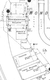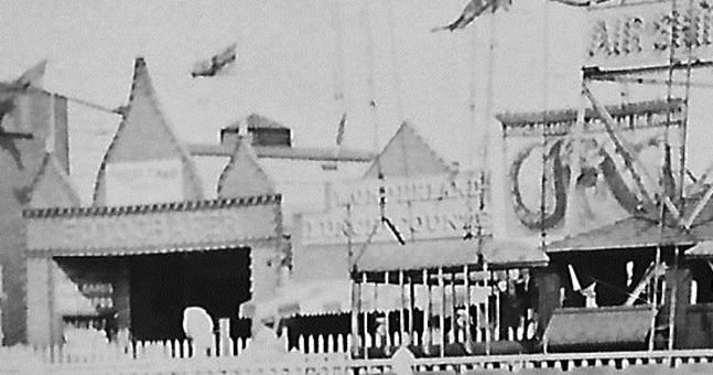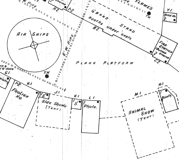 This closeup from the 1906 Sanborn Fire Insurance Map shows the Penny Arcade (labeled “Booth”) located between the Administration Building and the Theater. Notice that the Fatal Wedding is labeled a “Delusion”, rather than an “Illusion”. Was the cartographer making a little joke?