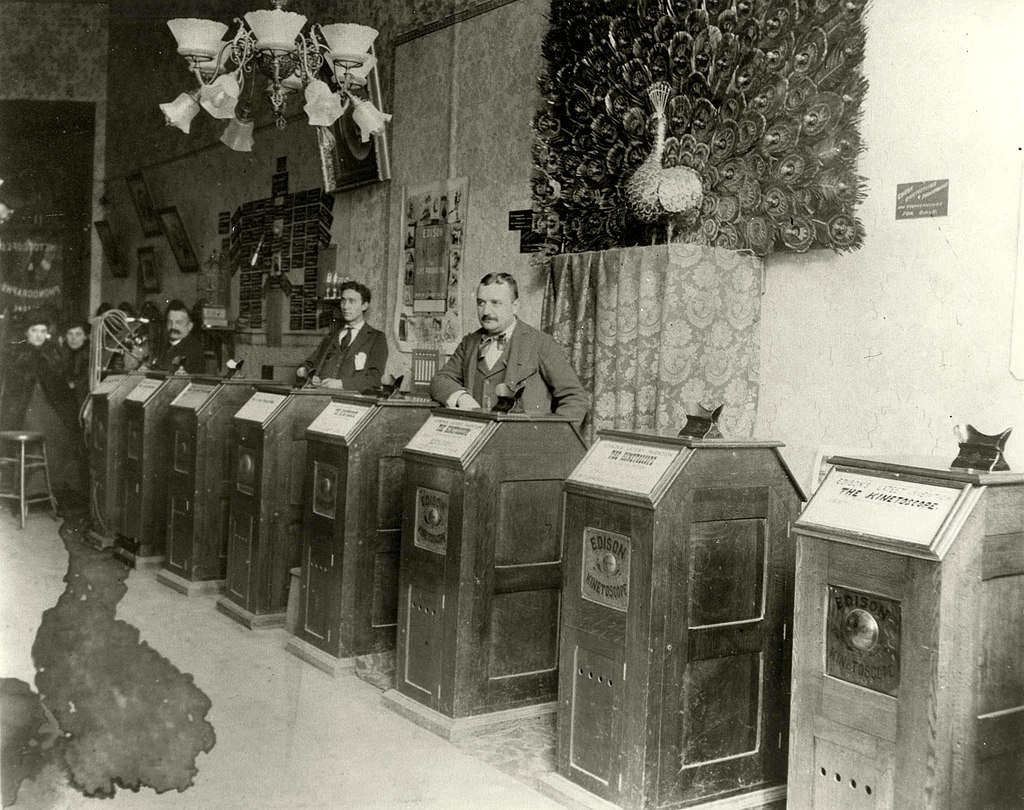 Top: Kinetoscope; bottom: San Francisco Kinetoscope parlor. Both from Wikipedia