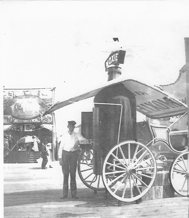 This photo shows, in the foreground, a Moxie salesman with his cart in the shape of a bottle of Moxie. In the background you can see the pavilion with a banner at the top reading “Tiny Mite — Smallest Horse in the World”. This was not far from the Third Degree funhouse.