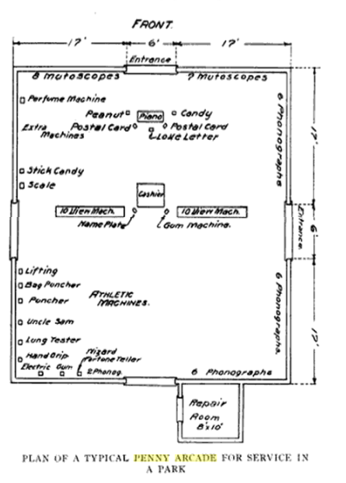 So at first Penny Arcades housed pay phonographs, kinetoscopes, and mutoscopes, where patrons would pay they penny or nickel for a brief entertainment, then roam off to another. But other amusements invariably crept in. An article in the March 24, 1906 edition of Street Railway Journal , a trade publication for streetcar companies, described what a typical Arcade should have. There should be a number of mutoscopes and phonographs, a cashier to make change for the coin-operated devices, and a selection of other devices.