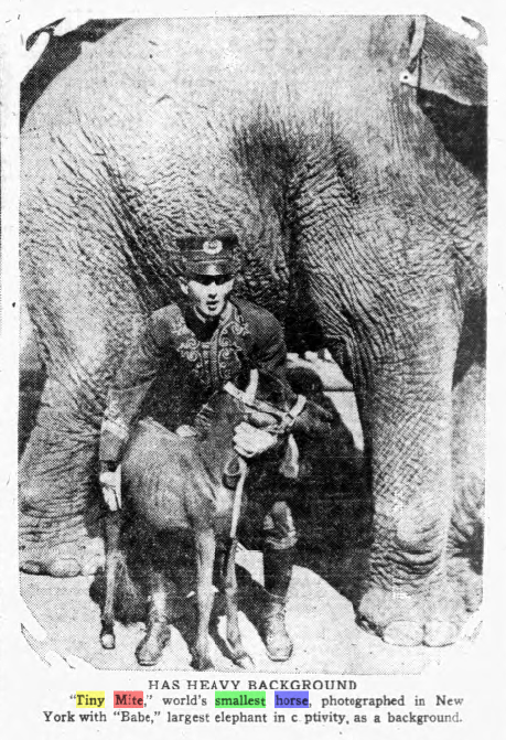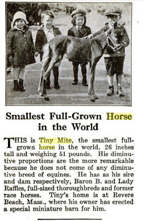 Prince Tiny Mite has a surprisingly long career. It’s possible that there was another miniature horse of the same name (or one using the same name to “cash in” on the original’s fame), but his active years could be spanned by the lifetime of a horse, so most if not all of the accounts probably refer to him.