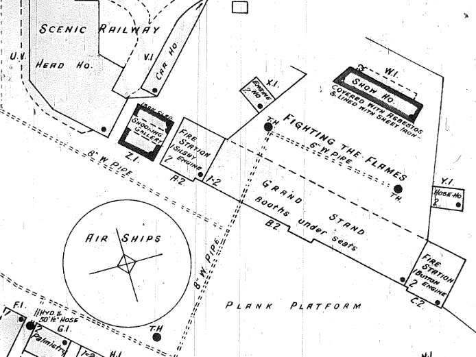 There was a Shooting Gallery nestled between the Fire and Flames grandstand and the Thompson Scenic Railway building. It’s not mentioned in any newspaper reports, and there are no photographs of it, so we would not even know about it, were it not for the 1906 Sanborn map