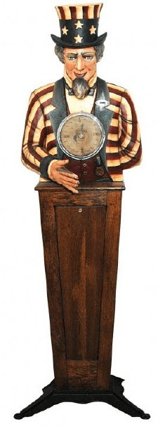 Some of these devices can still be found in amusement parks. — the punching bag, hand grip strength tester, scale, and candy dispenser. An “Uncle Sam” was another kind of hand grip strength tester, made in the shape of a statue of Uncle Sam. The patron put in his coin and tried to squeeze together Sam’s hand