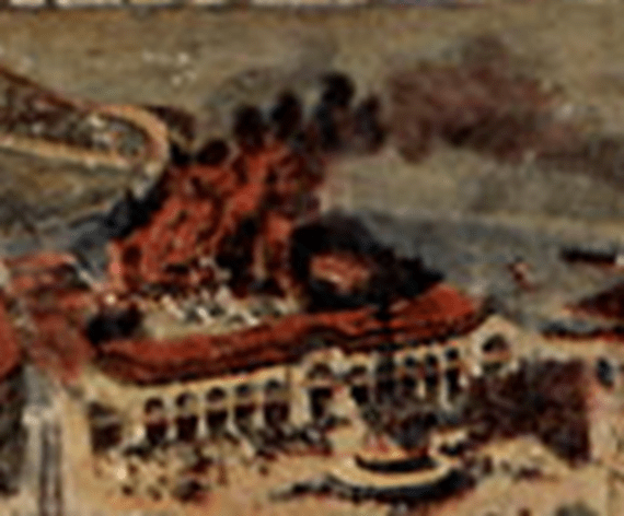 They constructed a grandstand that could hold 3500 people for the shows. I haven’t been able to find a photograph or drawing of the front of the grandstand, but it looked like this in the Birds Eye View conceptual painting: