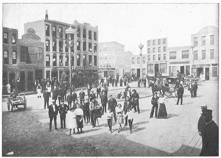 Street scene with the actors posing out front. The three buildings on the left are the ones set on fire (compare with the postcards above and below)