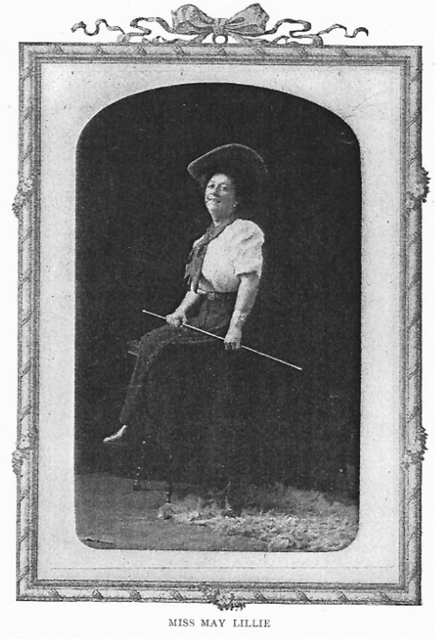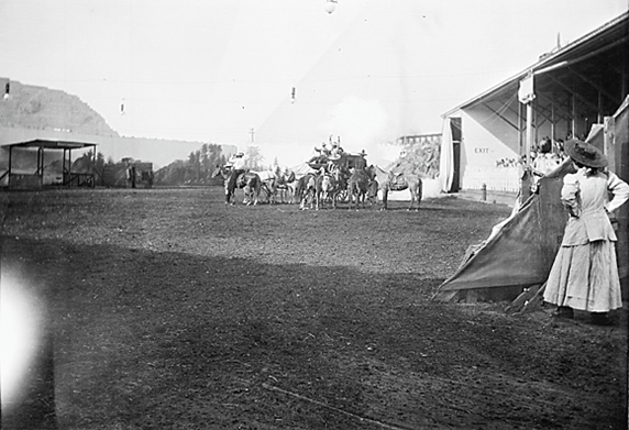 In this shot you can see part of the grandstand to the right, and the “set”, with painted backdrop, to the left. That might be May Lillie on the right.