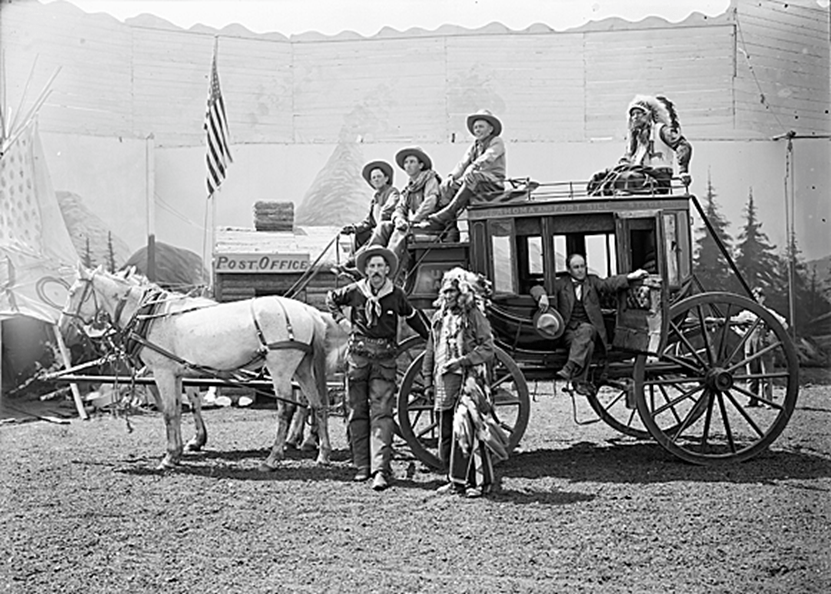 Stagecoach with cowboys and Indians on the Wild West Show “stage”. You can see the painted backdrop, the “Post Office” building, and a teepee off to the left.