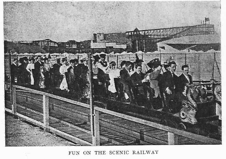 This image of passengers on the Thompson Scenic Railway from 1908 shows them in the station at the Home building. Behind the cars you can see what appears to be the back of the painted backdrop from the Wild West show. There was no need for this in previous years, since the city square buildings in the Fire and Flames show hid the railway from view of the spectators.