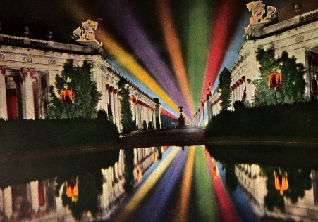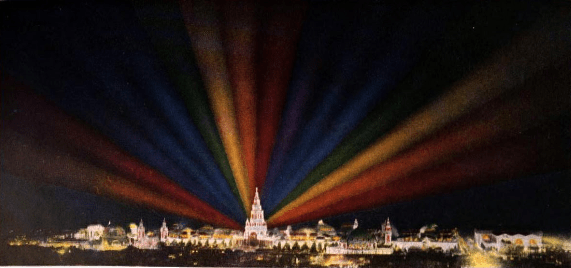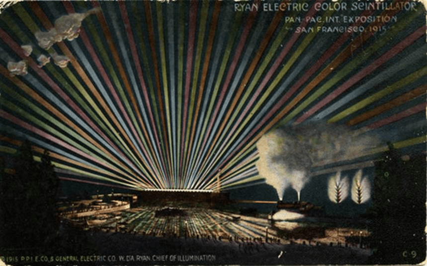 There are photographs of the Scintillator from the other expositions, but they really don’t convey the impact it had. The first Exposition for which we have color photos of the Scintillator is the 1915 Expo in San Francisco. Here are a few more:
