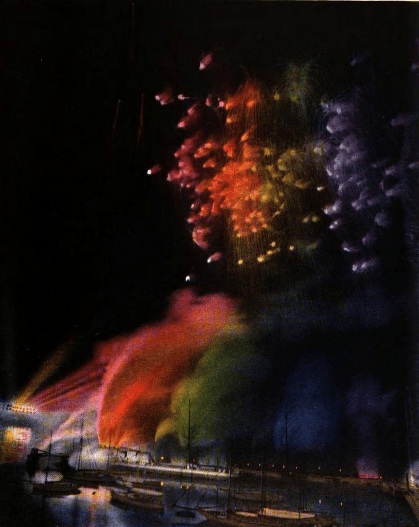 The beams of light could be moved independently, following hand and whistle commands from Ryan. Colors intersected and mixed, creating new colors, making plaid patterns. Special rotating nozzles made pinwheels and “Fighting Serpents”. and “Ghosts” The rays could diverge, or converge together. By using appropriate colors, they could duplicate the flags of different nations (something Ryan hoped would be a good feature for an international exposition).
