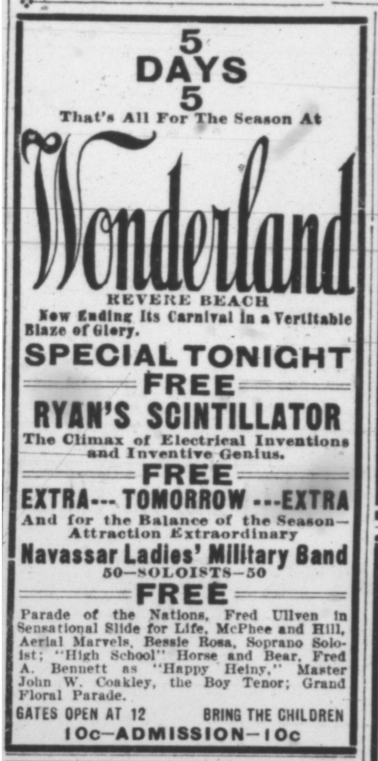 Finally, Thompson did the only reasonable thing — he bought the Scintillator. Or, rather, he purchased the use of it for the remainder of the summer. The Scintillator components were brought from Nahant, down the Causeway and into Revere, where they were set up in an empty portion of Wonderland, and used to advertise Wonderland Park. They took out ads in the papers