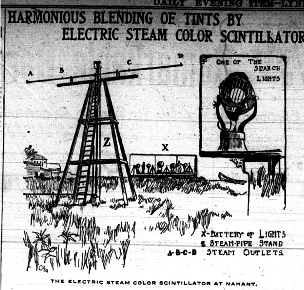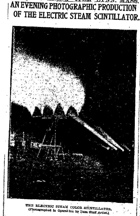 Floyd Thompson was furious. People were renting boats and coming out from Boston to gawk at the Scintillator, and not coming to Wonderland. So he waged war on the Scintillator. He urged people not to go. He got all the Wonderland searchlights together and pointed them at the sky over Nahant, hoping to drown out the colored Scintillator beams. None of it worked.
