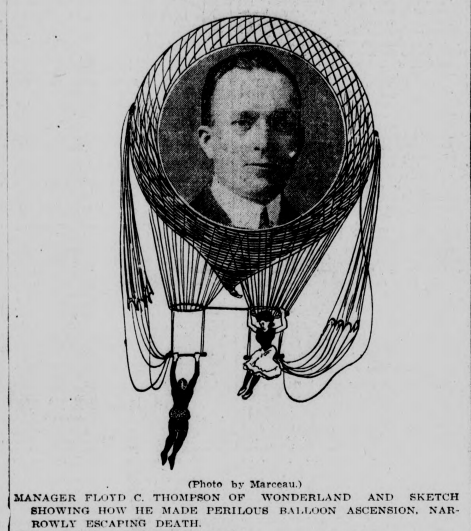 He had married each of his wives — Tiny was his third — in a ceremony that included a balloon ascension. For their engagement at Wonderland, they renamed their balloon the “Wonderland”. The act involved Tiny and another woman, local acrobat Amelia Garvin, going up on a balloon fitted with a double trapeze and with two parachutes unfolded, but with the top edge lightly attached near the top of the balloon. The balloon would ascend, tethered to a rope, and when it got to 2,500 feet they ladies would jump from their trapeze seats, the parachutes attached to them, and the parachutes would snap open and let them drift to the ground.