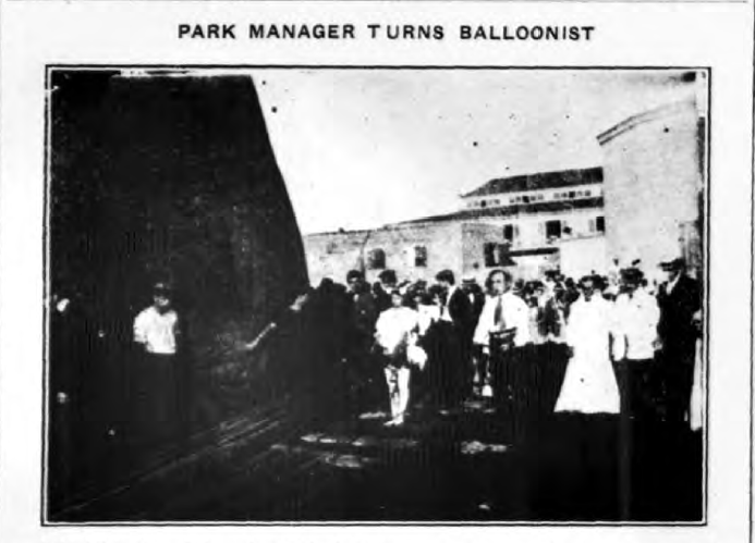 Above — poor-quality photograph showing Thompson getting ready to board the balloon in the space between the Hell Gate ride and the Carousel