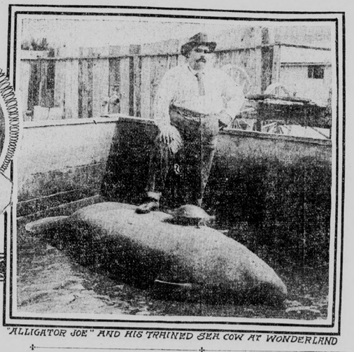 Alligator Joe with a sea cow. Sadly, shortly after the manatees arrived the pregnant manatee gave birth to a stillborn calf, and died herself.