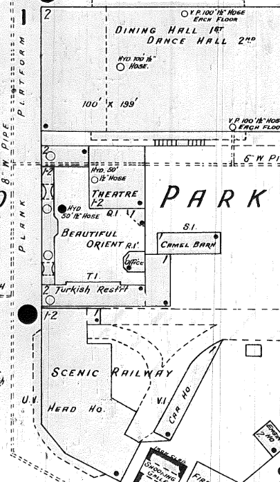The Beautiful Orient as shown on the 1906 Sanborn map. Note the Turkish Restaurant, the Theater, and the Camel Barn out back.