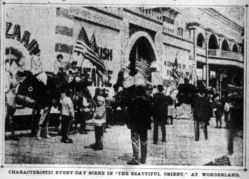 The Beautiful Orient, like many of the Wonderland attractions, comes from a line of attractions that were made popular by the World’s Fairs and then by the Coney Island parks. A man named Gaston Akoun started an attraction called The Streets of Cairo that played at several of the international expositions.