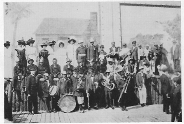 The Darktown company in front of the former Beautiful Orient/Florida Alligator Jungle Building. The Florida swamp and marsh scenes have been repainted to represent Southern Plantations and Slave Huts. Notice that there is an orchestra, police officers, and elegantly dressed ladies. I suspect that many of the performers are white actors in blackface.