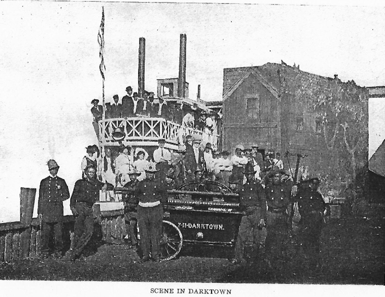 The Darktown Fire department in front of the steamboat “City of New Orleans”. Again, many of the Fire Department characters are probably in blackface.