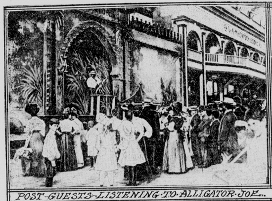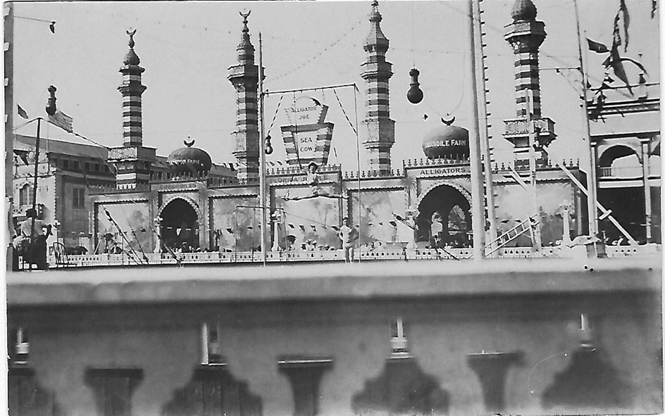The next year the Middle Eastern palace was transformed into the Florida Alligator Jungle by the simple expedients of painting over the word on the walls (“Bazaar”, “A Congress of Strange Oriental People”, and so forth) with scenes of Florida swamps and bayous. On the domes and and the “keystone” and over the doors were painted “Alligators”, “Crocodile Farm”, “Alligator Joe”, and “Sea Cow”