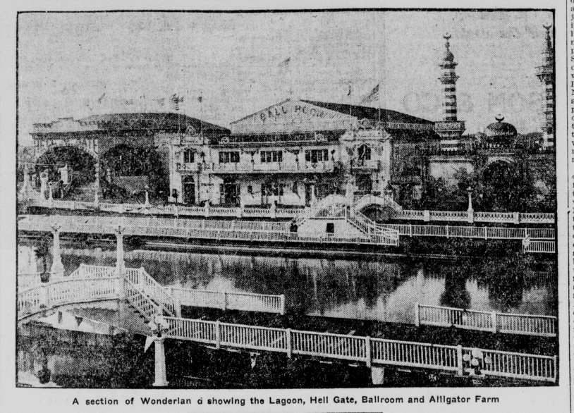Darktown was, to modern eyes, an outrageously racist attraction. It featured a musical performance, much like The South Before the War, the revue from Wonderland’s first year, a steamboat race between two miniature steamboats on the canal next to the attraction, with one of the boats “exploding”, and a performance by the Darktown Fire Brigade. It was produced and organized by the same W. C. Manning who put together the Fighting the Flames show the previous two years.