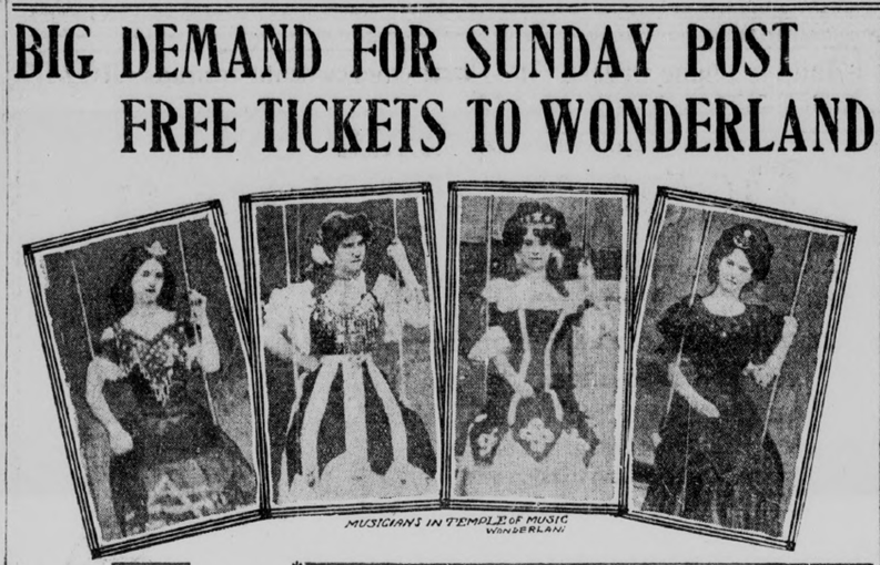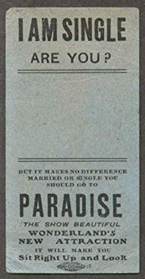 For the 1908 season the Theater housed Paradise — The Show Beautiful, the creation of Charles A. Washburn. Women walking through Wonderland Park would hand out these provocatively-worded tickets to prospective patrons:
