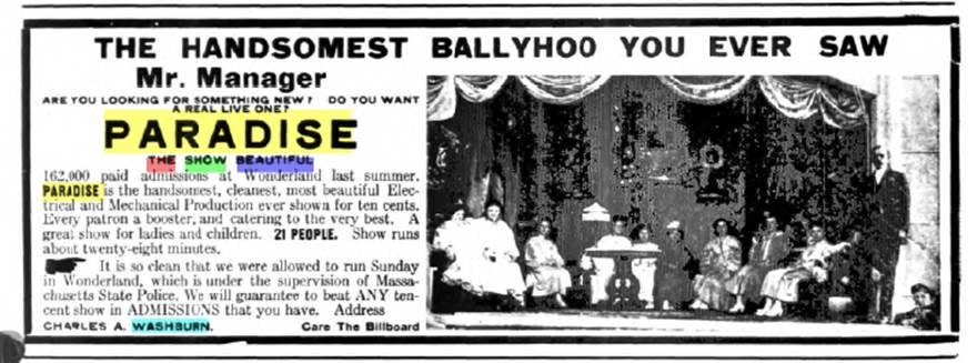 Alas for George Washburn, no one else appeared to want his Paradise show after its 1908 appearance at Wonderland.
