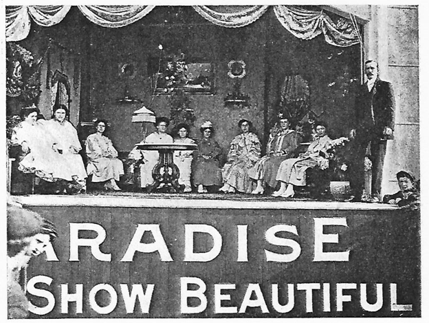That’s probably Washburn himself off to the right. The women appear to be seated as for a tea party, but advertisements for performers and those later “selling” the show suggest that it was a combination Beauty Pageant and Talent Show
