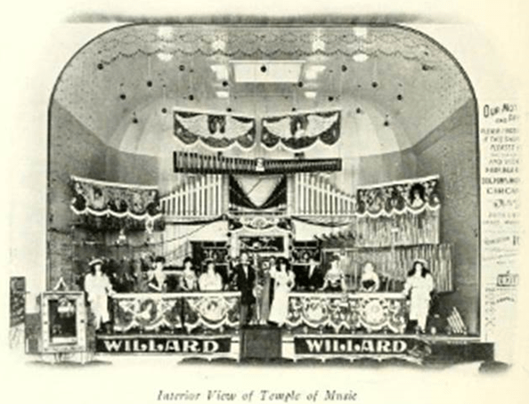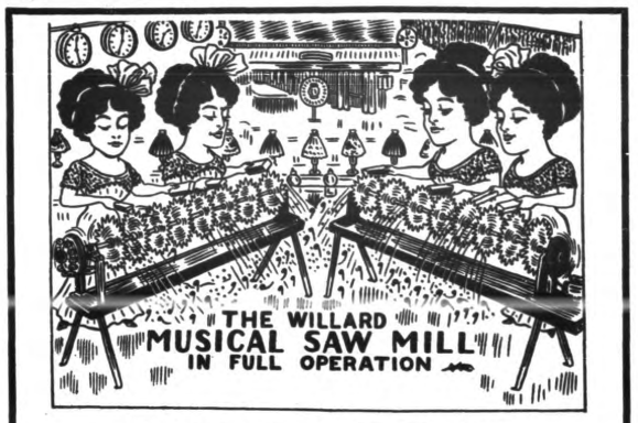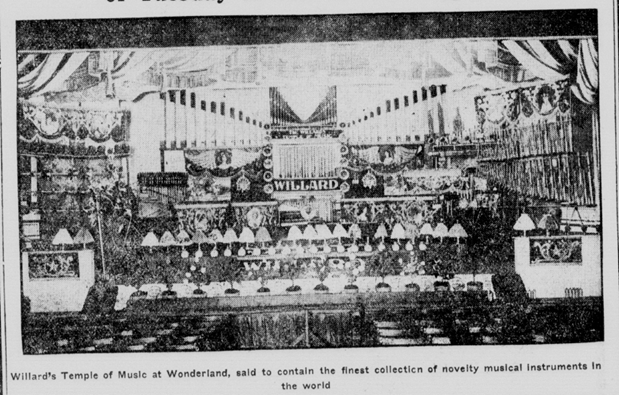 For 1907 it was replaced by Willard’s Temple of Music. Charles D. Willard and his wife Ettie (“Kittie”) were consummate musicians on ordinary instruments, but they branched out into exotic instruments that made an impressive display in whatever theater they performed in.