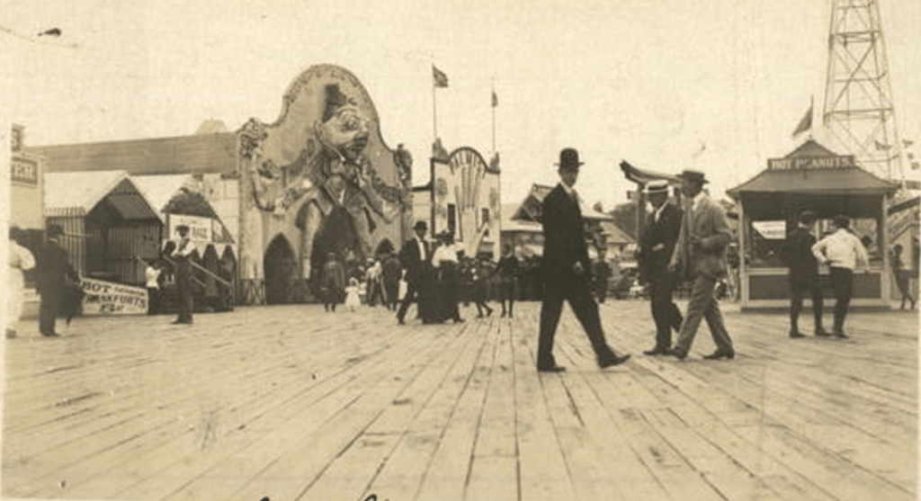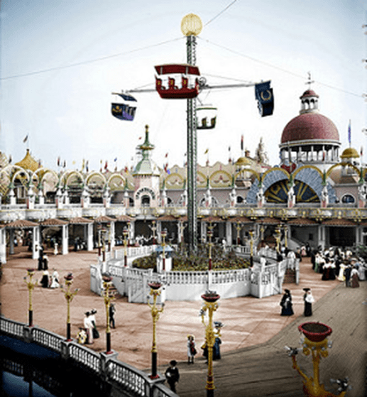 The Velvet Coaster was installed in Wonderland in 1907, the year after it opened. It was much more of what we think of as a “roller coaster” than the LaMarcus Thompson Scenic Railway, with its gentle up-and-down undulations. The Velvet Coaster had steeper drops and more sudden turns, but it was still not as jarring as other roller coasters, hence the name “Velvet” Coaster. They hoped to appeal to a crowd not looking for extreme attractions.