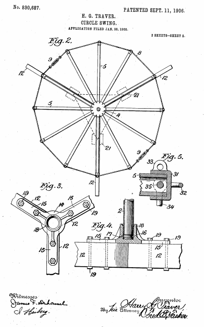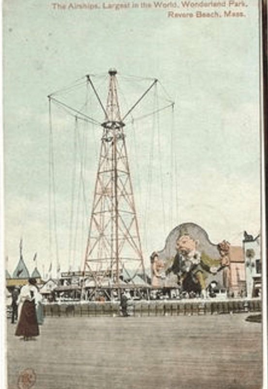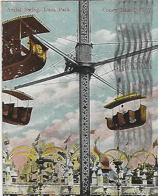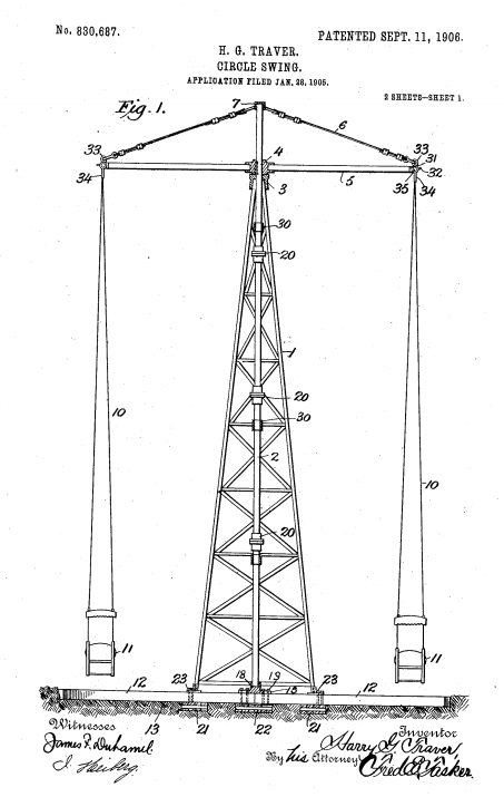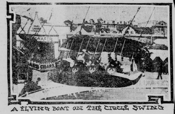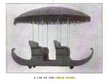 The Circle Swing, also called the Airships, was the invention of Harry Guy Traver. The ride went up in several parks and traveling shows (he had three different standard sizes), and the profit from it enabled him to create many other rides (he invented the Caterpillar, still a popular ride). He also went on to build what many still think of as the most extreme and terrifying roller coasters, including the Cyclone and the Lightning on Revere Beach.