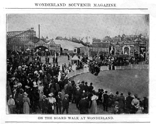 Photograph showing the Circle Swing tower (on the right) and the Palmist’s building band The Third Degree funhouse on the left. Notice the Boardwalk — all of the pedestrian walks in Wonderland were wooden boardwalks raised 2-3 feet above the ground.