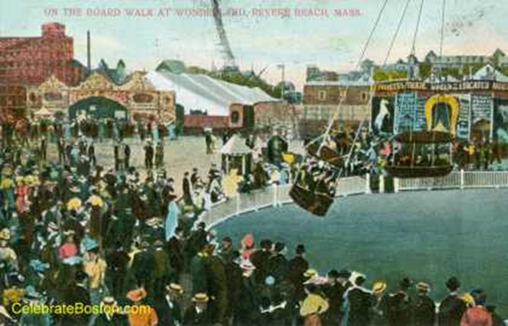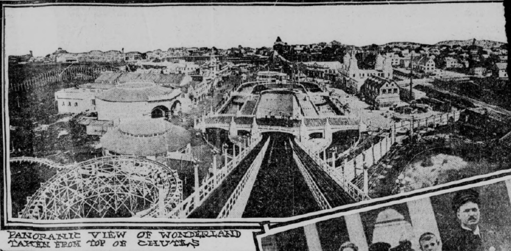 You can get glimpses of the ride off to one side in images from Wonderland, but not very good ones. I have no idea why they didn’t photograph this ride — possibly because, like the Carousel (which also appears in no Wonderland postcards) it was owned and operated by Louis Bopp, an independent manager who had other attractions on Revere Beach Boulevard.