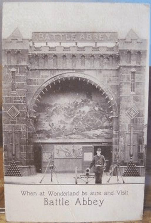 After the park’s first season they decided to replace the tent that TRixie performed in with a permanent structure. It was painted to resemble a stonework building and was called “Battle Abbey”. There had been a “Battle Abbey” at the St. Louis 1904 exposition, which featured six large cycloramas depicting famous battle scenes — Yorktown, Gettysburg, Custer’s Last Stand, New Orleans, Buena Vista, and the battle of Manila. There were other “Battle Abbeys” built or proposed around the country. All of them ultimately derived their name from the Benedictine Abbey in the English town of Battle in East Sussex, which was built on the site of the Battle of Hastings.
