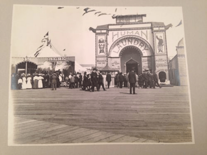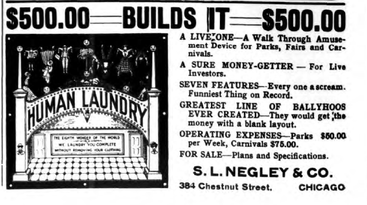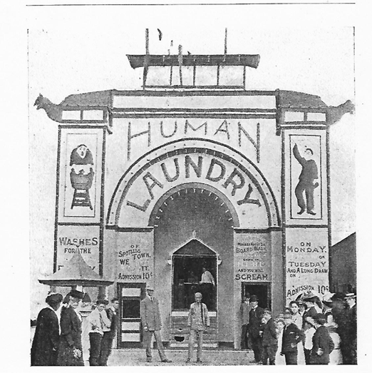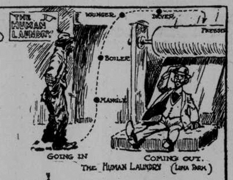 The next year the building underwent an enormous change, becoming The Human Laundry. This was a franchised attraction, as the following ad shows. It first appeared in 1907, but branched out to many more in the summer of 1908: