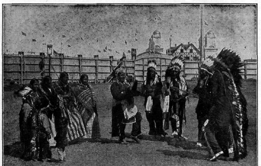 Photo of the Indian Congress. Beyond the fence that ran around the show grounds, you cab see the tops of the Infant Incubator Building, the Wonderland Entrance/Administration building, and the shaft of the Whirl the Whirl ride. The gates into the grounds are obvious from their being higher than the rest of the fence.