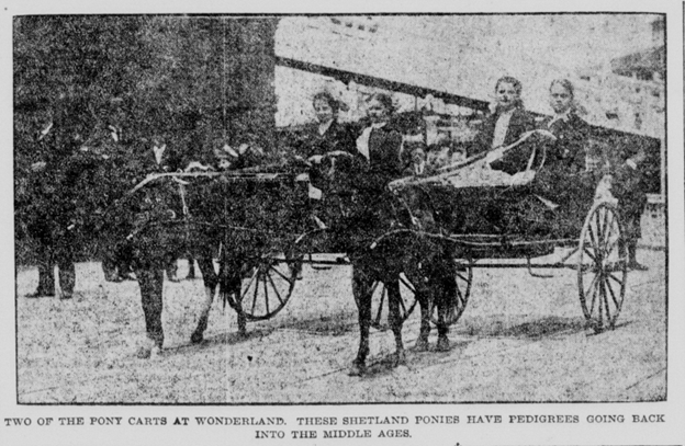 For the second season the show was replaced by Pony Rides, which took place in the oval track used by the Wild West Show. They had two dozen Shetland ponies and carts to ride in. A report from the spring of 1907 called the area the “Children’s Paradise”, but no later report of that name appears.