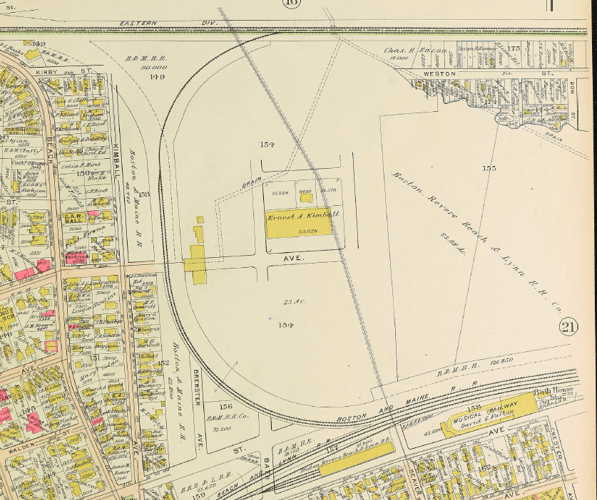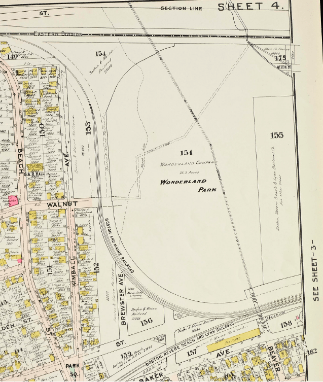 Another reason that the streets and blocks were not constructed is that the two sets of Boston and Maine Railroad tracks cut that section off from the rest of Revere. Even though the eastern loop (on the right in the above map section) wasn’t really an active train track (being used to store unused rolling stock), it still had to be crossed somehow, and there were no crossings. Wonderland got around this by building a bridge for each of their two entrances, both of the crossing that unused spur of track.