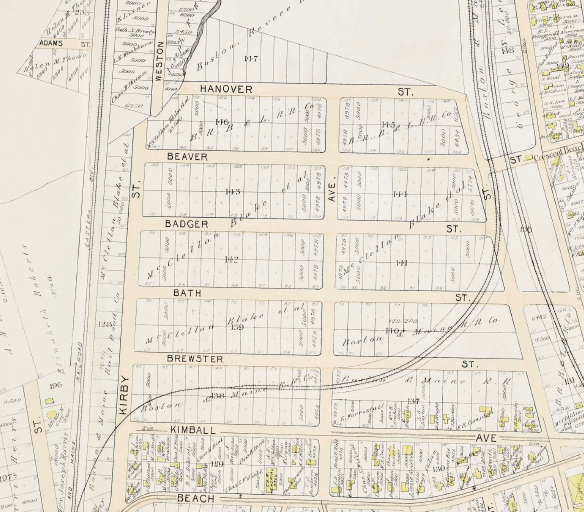 This map shows the section of Revere where Wonderland was built as it was originally laid out. None of these streets in the space between the train tracks — Brewster, Bath, Badger, Beaver, Hanover — were ever built (although the parts of Brewster, Bath, and Beaver outside the train tracks were built)