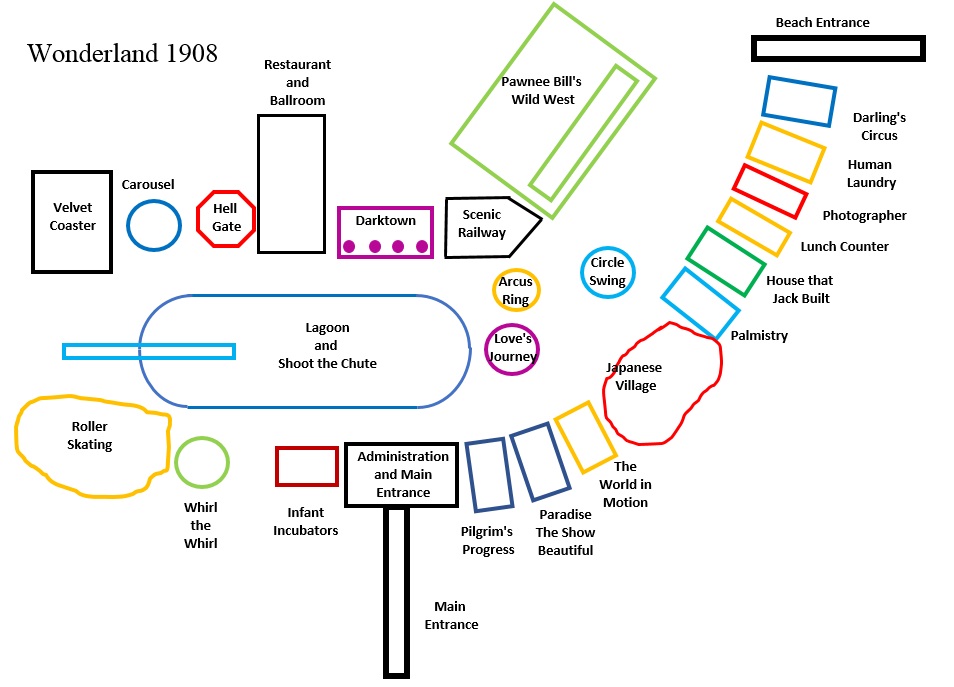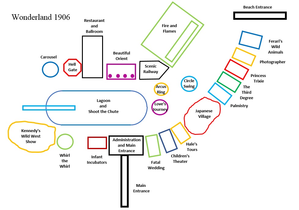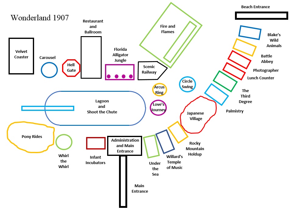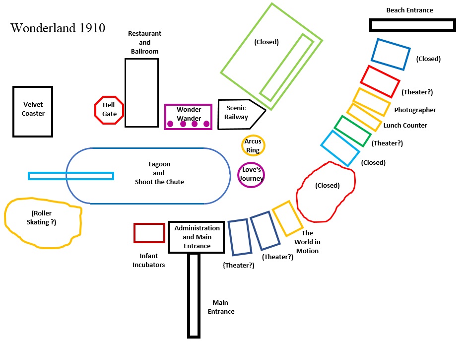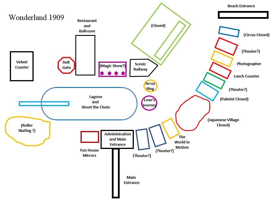 North is at the top, East to the right. The sketch is only meant to show where the attractions are relative to each other, and is not done to scale. (as you can see from the above scale map, the Palmistry building was much smaller than the Third Degree. There was also a lot more to the Beautiful Orient and the Scenic Railway, but this shows where the facades were located.) The Penny Arcade isn’t indicated here, but it lies between the Administration Building and the Fatal Wedding.