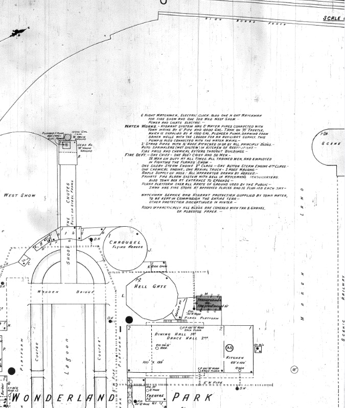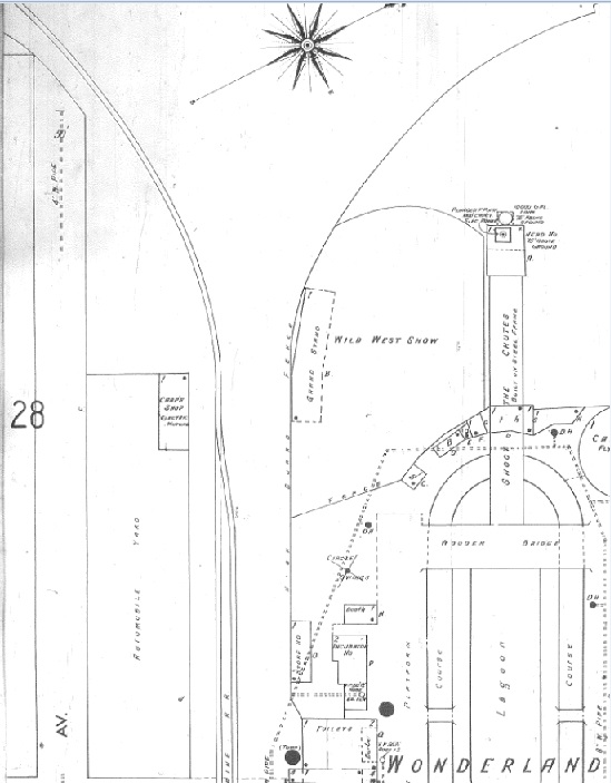 This map shows the area in 1914, after the Park had been closed for four years. I cannot identify the building shown. North is to the right
