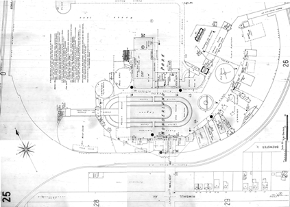 The 1906 Sanborn Fire Insurance Map, however, has all the details of the structures. We show it here in pieces so that you can see the details. Here’s the Southwest Corner (Note: In the Sanborn Maps, North is on the Right side):