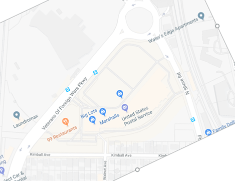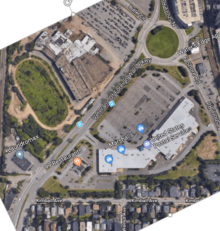 The images below show the 1906 Wonderland map with North at the top, followed by a modern map of the area at the same scale and orientation, followed by an aerial photograph of the area today. Most of the park is occupied by the Wonderland Marketplace Mall and its parking lot. Not that you can still see where the railroad spur ran, and that the Mall buildings occupy the same spaces as many of the Wonderland Park buildings. North of the big roads — Route 1A — is where Wonderland Greyhound Park was. About the only part of Wonderland Amusement Park that extended there is the LaMarcus A. Thompson Scenic Railway.